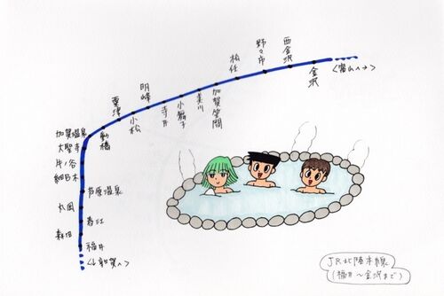 こんにちは。英男(小5)です。 今日は路線図を紹介します。 こちら! モデルは左から絵都(かいと・小5)、ぼく・英男、叶芽(かなめ・小5)です。一緒に温泉に入っています。 今日は前回に引き続き、「JR北陸本線」です。 前回は米原駅~福井駅までを紹介…